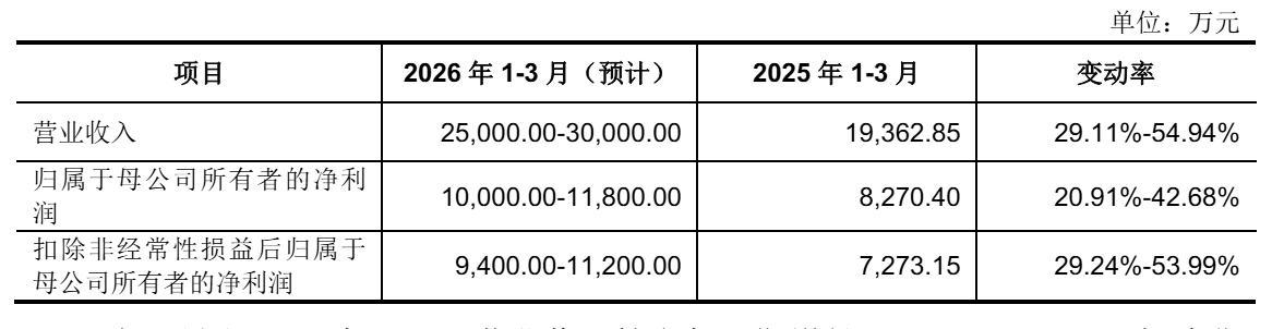三瑞智能预计2026年第一季度营收为2.5亿到3亿,较上年同期的1.94亿增长29.11%到54.94%;预计净利为1亿到1.18亿,较上年同期的8270万元增长20.91%到42.68%;预计扣非后净利为9400万到1.12亿,较上年同期的7273万元增长29.24%到54%。